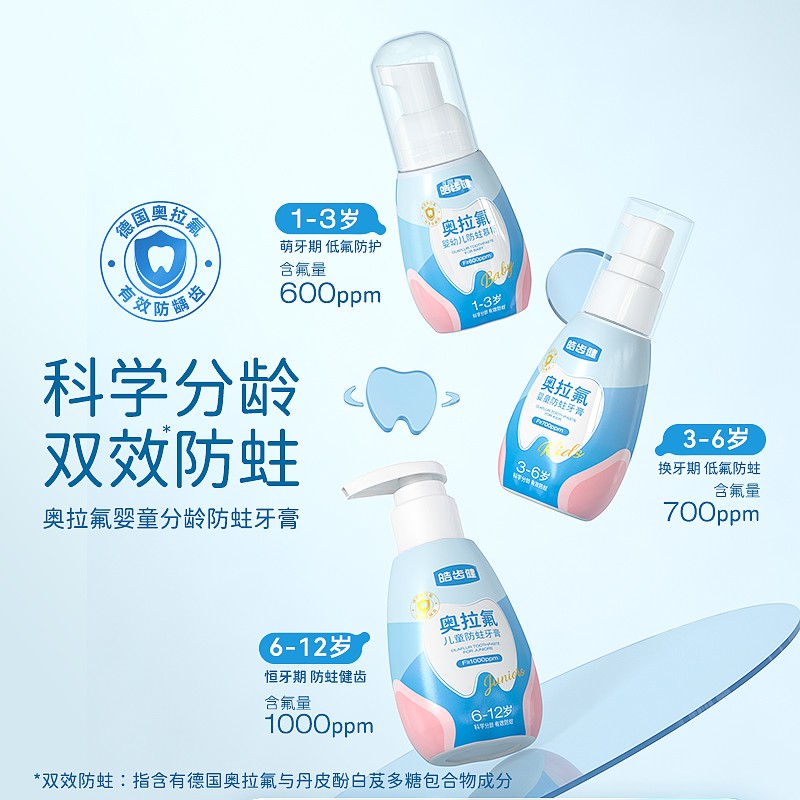 - 1-3歲:0.06%微氟+慕斯質(zhì)地,溫和清潔乳牙;